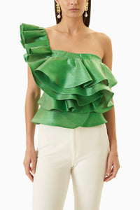 Silk lama statement top, one shoulder, spiral ruffle detailing on front of the top, tulip Peplum top, center back, open metal zipper.