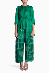 Featuring Green Origami Pant Set rye bandhani pants paired with top with adjustable waist belt and tassle details