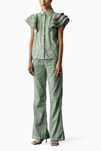 Featuring the Green Overdyed Zipper Frill Shirt, made from 100% cotton in an overdyed finish. This sleeveless shirt features zipper detailing on the frills, a front opening with buttons, and a concealed placket, all in a comfortable regular fit.