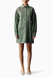 Featuring Green Overdyed Mirror Embellished Dress, a stunning addition to your collection. Crafted from 100% cotton in an overdyed finish, it showcases exquisite mirror embellishments on the front and sleeves, with gathered sleeves featuring cuffs and buttons. The dress comes with a front opening secured by buttons, all in a comfortable regular fit. Elevate your style with this captivating piece.