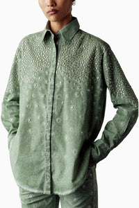 Featuring the Green Overdyed Mirror Embellished Shirt by Mellow Drama, this 100% cotton overdyed shirt is adorned with mirror embellishments on the front and sleeves. It offers a front opening with buttons, full sleeves with cuff and buttons, and a comfortable regular fit. Elevate your fashion game!