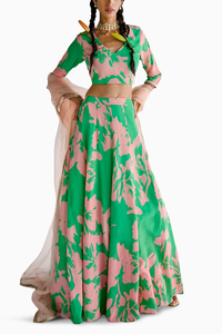 Featuring a green and pink highlighted blouse, it comes along with a lehenga and optional dupatta.