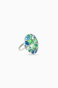 Featuring Green Psychedelic Rings by Manner India. This ring is a statement piece, and is adjustable ring size, handcrafted in 92.5% silver, and has an anti-tarnish protective coating. The ring has beautiful enameling details in vibrant colors, this comfortable adjustable ring can be worn by pairing two colors to add charm and make it a conversation piece.