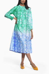 A festive season delight, our Green Purple Ombre Shibori Tunic is embellished with antic gold sequins. The subtle color combination is perfect for the upcoming festive and wedding season. The tunic has a round neckline with front gatherings.