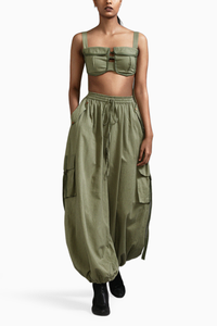 A set of well-fitted pocket corset with adjustable straps and elastic back with Baggy-fit cargo pants with side pockets and elastic back.