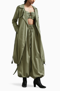A set of well-fitted pocket corset with adjustable straps and elastic back with Baggy-fit cargo pants with side pockets and elastic back & an Over-sized Trench Jacket with elastic hem, side pockets and canvas belt.
