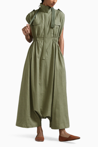 A Classic mati jumpsuit with high-acollar and safari details. Front zipper opening, Side pockets and elastic at the waist for a comfort fit.