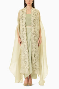 Make a bold statement with Ritika Arya Jain's Green Signature Cape with Cami Blouse & Draped Skirt. This three-piece coord set, crafted from organza, satin, and crepe, offers a true-to-size fit, combining a stunning cape, a chic cami blouse, and a flowing draped skirt for a sophisticated look.