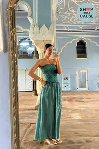 Silvassa Dress is handcrafted using striped cotton fabric. It features a smocked elasticised tube top and has a fit and flare silhouette for a comfort fit.