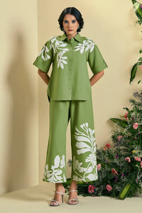 A blend of comfort and elegance, this green co-ord set offers a rich, refined look with intricate embroidery and delicate chanderi silk appliqué work on both the shirt and pants. Paired with comfortable wide-legged trousers, it’s designed to flow effortlessly from day to evening with ease and style.