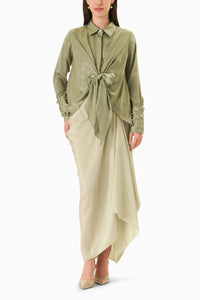 Step into effortless style with Ritika Arya Jain's Green Tie-Up Shirt with Drape Skirt. Made from luxurious satin, this two-piece coord set in a rich green hue offers a true-to-size fit, combining a chic tie-up shirt with a flowing drape skirt for a sophisticated look.