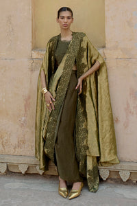 Featuring Green Tissue Jacket Saree Set by Ritika Arya Jain's RAYA collection, a fusion of fluid drapery and sculpted modernity. Intricately embroidered lace borders bloom like whispers of heritage, while the sharply cut blouse adds a bold, feminine edge to this classic design.