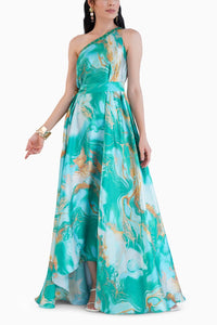 Featuring the Green Trippy Romance Printed One Shoulder Kaftan Dress by Mandira Wirk's Waves of Love Collection. Crafted from soft satin and paired with a chic belt, this stunning dress offers a vibrant print and a flattering fit, perfect for any stylish occasion.