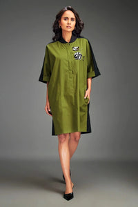 Featuring Green Two Tone Dress by Deepika Aroras Into The Wild Collection, this color-blocked midi dress offers a relaxed silhouette with a round collar, half sleeves, and metallic embellishments for a chic, contemporary look.