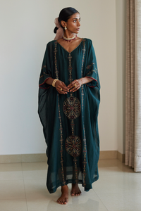 Featuring Green Uday Kaftaan by Sarang Kaur by Akaari Collection. This Chanderi silk kaftaan paired with a cotton undershirt exudes effortless elegance in a serene green tone. Perfect for leisurely days or special events, it combines comfort with refined style.