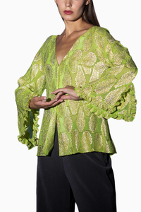 Featuring Green V-Neck Top With Flared Sleeves by Swatee Singh. Adorn yourself in leaf green Georgette. This relaxed-fit top, with a V-neck and flared sleeves, is a chic expression of modern elegance.
