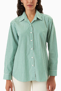 Featuring the Knot & Go Shirt by Trisara, this green and white striped cotton shirt adds a playful twist with two tie knots at the back. Its straight silhouette offers a modern, relaxed vibe perfect for effortless everyday style.