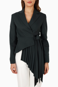 There are no buttons in this blazer! Instead, you can adjust the fit by wrapping it across the bodice and adjusting the fit and tightness with the knot. The combination of a solid, asymmetrically cut right panel and a pleated, asymmetric left panel creates a visually intriguing interplay of shape and texture. The absence of buttons and the wrap-around style give you ultimate control over the fit and silhouette. You can cinch it in for a sleek, hourglass figure, or leave it loose for a more relaxed, drapey look. The blazer's length falls well below your hips and so provides ample coverage. It can visually elongate your silhouette
