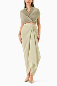 Embrace chic elegance with Ritika Arya Jain's Green Wrinkle Blouse with Draped Skirt. This two-piece coord set, crafted from crepe and satin in a vibrant green hue, offers a true-to-size fit, featuring a stylish wrinkle blouse paired with a flowing draped skirt for a sophisticated look.