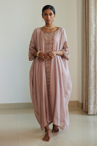 Featuring Grey Adree Kaftaan by Sarang Kaur by Akaari Collection. Crafted by Chanderi silk with a comfortable cotton undershirt, this kaftaan embodies understated elegance in a versatile grey shade. Ideal for any occasion, it blends sophistication with relaxed comfort effortlessly.