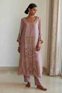 Featuring Grey Akaari Kurta Set by Sarang Kaur by Akaari Collection. This ensemble showcases a Chanderi silk kurta and pants in a refined grey hue. Combining comfort with timeless elegance, it's an ideal choice for both casual outings and special occasions