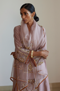 Featuring Grey Akaari Stole by Sarang Kaur by Akaari Collection. Crafted by luxurious organza silk, this stole adds an elegant touch in a sophisticated grey hue. Perfect for layering with any outfit, it enhances your style with its lightweight and graceful drape.
