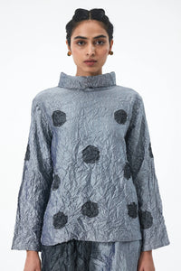 A relaxed fit, high neck textured top in silk featuring contrast appliquè polkas. This versatile silhouette features a soft roll neck, full sleeves and a fit that drapes comfortably on the body.