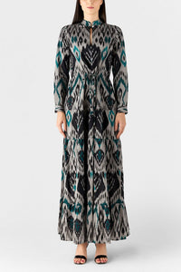 The Grey Duena Dress is made of Grey, Black, and Aqua blue handloom Ikat from India. This elegant dress features long sleeves, a mandarin collar, front buttons, and a pull waist string.