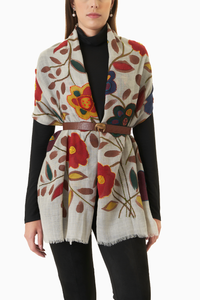 Our collection of Shawls in 100% Merino Wool for modern and resourceful women. The entirely hand-painted scarf with katha style embroidery on melange wool is characterized by a size of 70 x 180 cm. A classic fabric with a contemporary print. Perfect to be wrapped around the neck and wear it in a casual and contemporary way.