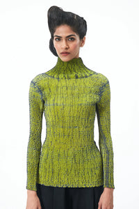 A sculptural take on a skivi achieved through hand crafted shibori, this high neck top features fluid texture that contours your form. Crafted in Silk and dyed in shades of lime and grey, it adds depth to your look making it an easy to style staple.