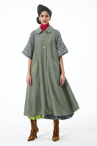 Button down Dress with raglan sleeve in a contrasting weave. Amplified with hand embroidered polkas spread across the woven checks adding to the playfulness. The dress is detailed with a box pleat at the back adding to the ease of movement, making it adaptible to wear as is or as an overlayer.