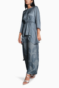 Featuring Grey Origami bandhani pants paired with a top with an adjustable waist belt and tassle details.