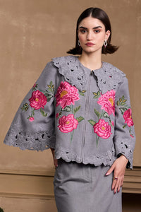 This chic grey felt jacket features exquisite rose-inspired threadwork and elegant cutwork details, adding texture and depth to its design. The short, tailored silhouette gives it a modern edge, making it a versatile piece that pairs well with both traditional and contemporary outfits. Perfect for adding a touch of sophistication to any ensemble, this jacket blends artistry and style effortlessly.