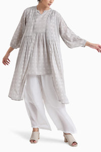 Featuring Grey Sunkissed Layer Co-ord Set by Jayati Goenka from Sunkissed Collection A classic three piece Block printed soft cotton set for all-day occasions. Long robe paired with no sleeve top and soft cotton printed trousers with pockets. Each piece is minutely detailed with handwork in golden thread and signature handmade buttons.
