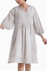 Featuring Grey Sunkissed Printed Midi Dress by Jayati Goenka from the Sunkissed Collection. The midi dress comes with voluminous sleeves with gathers in the waistline. It is a fit and flare dress with an overall block printed flared hem is a perfect go-to dress. The dress has an attached lining Each piece is minutely detailed with handwork in golden thread and signature handmade buttons.