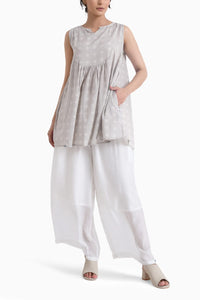 Featuring Grey Sunkissed Top with Pants by Jayati Goenka from the Sunkissed Collection. Block printed Sleeveless flared yoke top paired with soft finishhed silk llike white trousers with pockets.The top and the trousers is minutely detailed with handwork in golden thread and by signature handmade buttons.