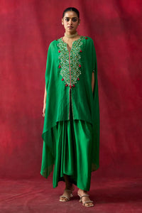 Featuring a green thin Chanderi cape, adorned with thread and hand embroidery, finished with elegant tassel details. Styled with a flowing silk satin draped skirt and paired with a short cotton slip, this ensemble offers a graceful fusion of texture, movement, and artisanal charm.