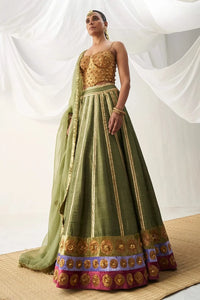 Featuring Gul-Mehendi B Olive Lehenga by ITRH's Sona Chandi Collection, this Set includes an antique embroidered corSet paired with an olive raw silk lehenga. The lehenga showcases gota stripes and dot embroidery on the color-blocked border, creating a perfect blend of tradition and modernity.