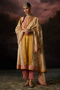 Featuring Gul Multicolor Kurta by Swatti Kapoor's Firdaus collection. This handwoven Chanderi Zari stripe kurta showcases a color-blocked paneled design, adorned with fine hand embroidery and delicate fringing, paired perfectly with a 100% cotton slip for comfort and style.