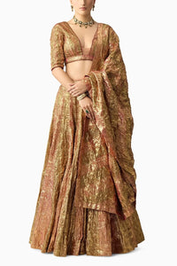 The Gulabo Do Rang Lehenga Set showcases a striking blend of vermillion and cherry red in a striped design, highlighted with diagonal metallic lampi work. This vibrant lehenga and blouse set features back hook and side zip closures, offering a bold, festive look with rich red, maroon, and gold tones.