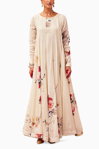 Elevate your wardrobe with this stunning maxi dress, designed to make a statement. Featuring a voluminous floral print that exudes timeless charm, the dress is crafted from soft, breathable cotton mul fabric, ensuring comfort and ease throughout the day. The neckline, hemline, and cuffs are adorned with intricate bijiya gota detailing, adding a touch of elegance and sophistication. The flowing silhouette of the dress enhances its graceful movement, making it a perfect choice for both casual outings and special occasions.