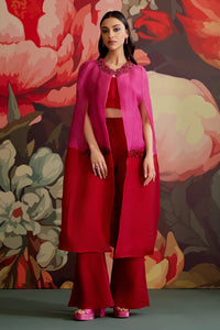 Composition- Cape- Pure Crepe, Pants - Pure Crepe, Inner - Pure Crepe Color- Red, Fushcia Details- Bunch of small Roses and Organza Balls Fit- Fitted Components- 3 Product Code- SVEPARUFS24CKS00OPINK