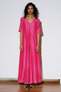 Featuring the Gulfam Jumpsuit, a bright pink design crafted from Chanderi silk. It showcases bijiya gota detailing on the neckline, hemline, and sleeves. Fully lined and handcrafted in India, this jumpsuit includes side seam pockets and a front zipper for easy wear.