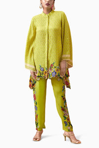 The Yellow Gulista Applique Kurta features exquisite floral applique work with flared sleeves, offering a vibrant and graceful look. Paired with sleek pants in luxurious Malaysian silk, this ensemble combines elegance with comfort. Ideal for festive or semi-formal occasions, a perfect blend of contemporary style and traditional craftsmanship.