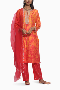 Gulkand' represents the sweet Indian flavors of festivities. Crafted in luxurious silk fabric, each thread of this collection comes from the roots of our traditional methods of dyeing and handcraftsmanship. A classic color combination for the festive season! Featuring a beautifully hand-embroidered silk kurta with floral shibori prints, this kurta set comes with embroidered pants and a matching silk organza dupatta.