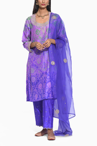 Gulkand' represents the sweet Indian flavors of festivities. Crafted in luxurious silk fabric, each thread of this collection comes from the roots of our traditional methods of dyeing and handcraftsmanship. A classic color combination for the festive season! Featuring a beautifully hand-embroidered silk kurta with floral shibori prints, this kurta set comes with embroidered pants and a matching silk organza dupatta.