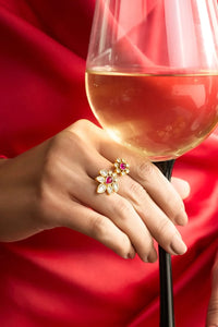 The Essence-The dainty floral motifs studded with Lush Crimson stones, and surrounded by Iceberg stones, come together as a stunning in-between finger ring