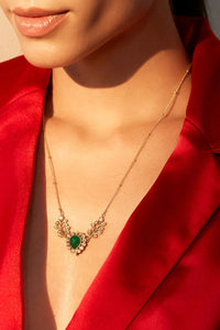The Essence-This dainty necklace features a green-hued Regal Moss centre stone, encircled by gleaming Iceberg stones. The studded leaf-like motifs accentuate the design.
