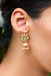 The Essence-This quintessential jhumki-styled pair has a blush pink tonality with stone-studded floral motifs to accentuate the fine design of the jewelry.