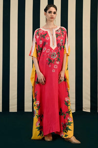 Featuring the Gulmohar Kavya Kaftan in Fuchsia from Swati Vijaivargie’s Gulmohar Collection – grace redefined in vibrant silk, adorned with intricate mirror work and a subtle side slit. A striking statement of elegance, where tradition meets contemporary allure.